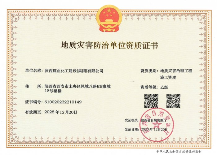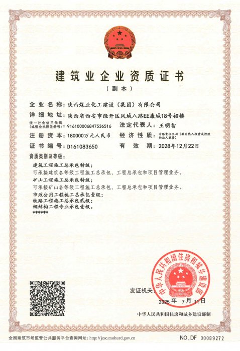 擁有建筑工程施工總承包、礦山工程施工總承包“雙特級”資質(zhì)和建筑行業(yè)甲級、煤炭行業(yè)(礦井、選煤廠)專業(yè)甲級設計資質(zhì);市政公用工程、鋼結(jié)構(gòu)工程、起重設備安裝工程、環(huán)保工程、建筑裝修裝飾工程、地基基礎工程、古建筑工程一級承包資質(zhì);機電工程、公路工程、冶金工程、鐵路工程、水利水電工程、石油化工工程、電力工程、隧道工程二級承包資質(zhì),同時具有特種工程專業(yè)承包資質(zhì)。